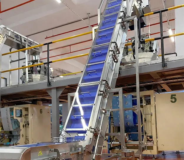 Conveyor solutions that ensure regular, controlled and stable transportation of packaged products from vertical packaging machines, safely feeding quality control and end-of-line processes.