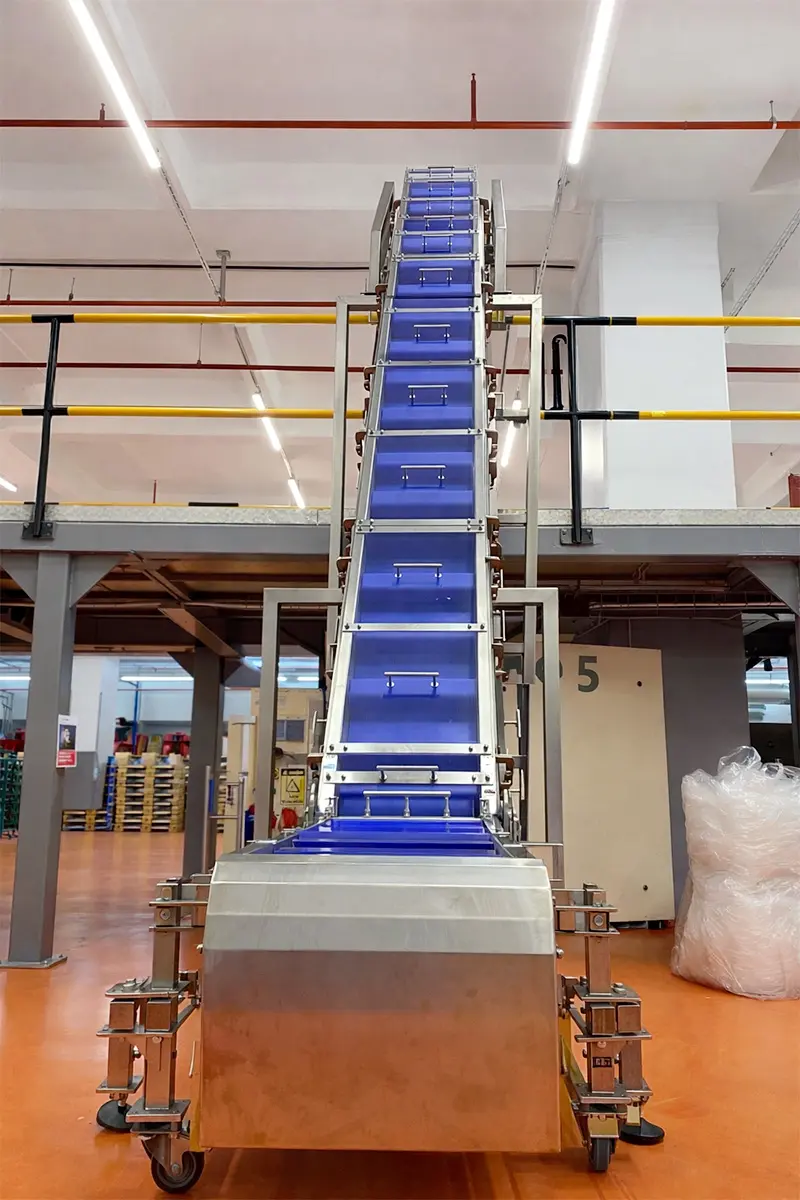 The belt or bucket carrier structure used in elevator conveyors keeps the product stable during transport. The inverter-controlled drive system adapts to the line tempo at feeding and discharge points, reducing the risks of accumulation, spillage, and irregular flow. This structure provides stable vertical transport flow, especially in packaging and filling lines that require continuous and synchronized operation.