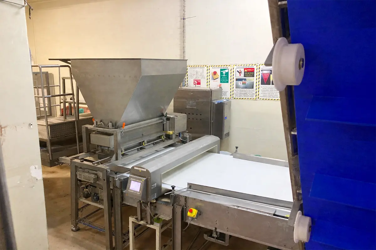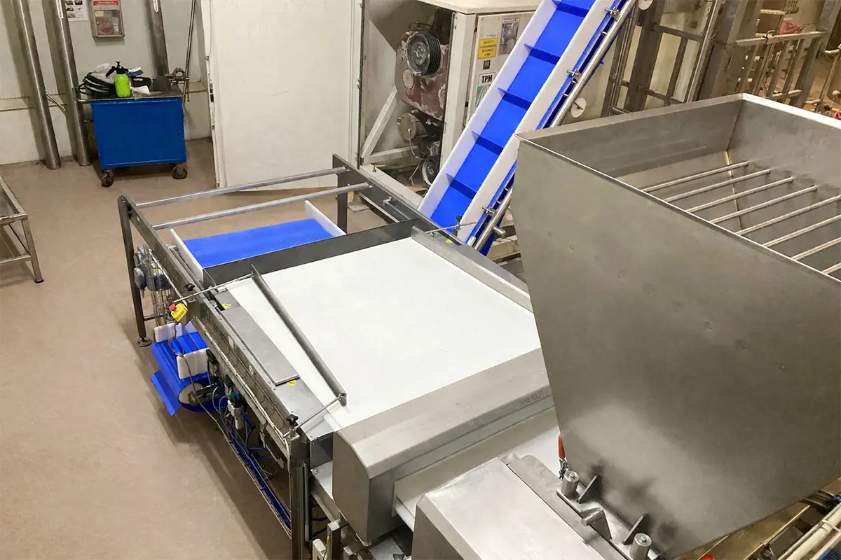 Grinding machine, open product conveyors, metal detector control point