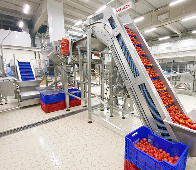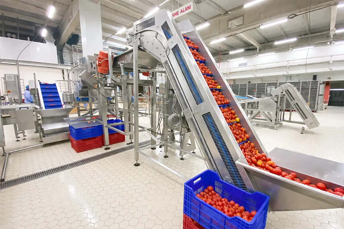 It comprises an integrated conveyor solution developed for fast, orderly, and controlled transfer of products from cutting and slicing processes to the cup-up station. The system, consisting of a vibrating unit, modular belt conveyor, and elevator units, stabilizes scattered product flow after cutting and provides rapid feeding toward the cup-up machine.
