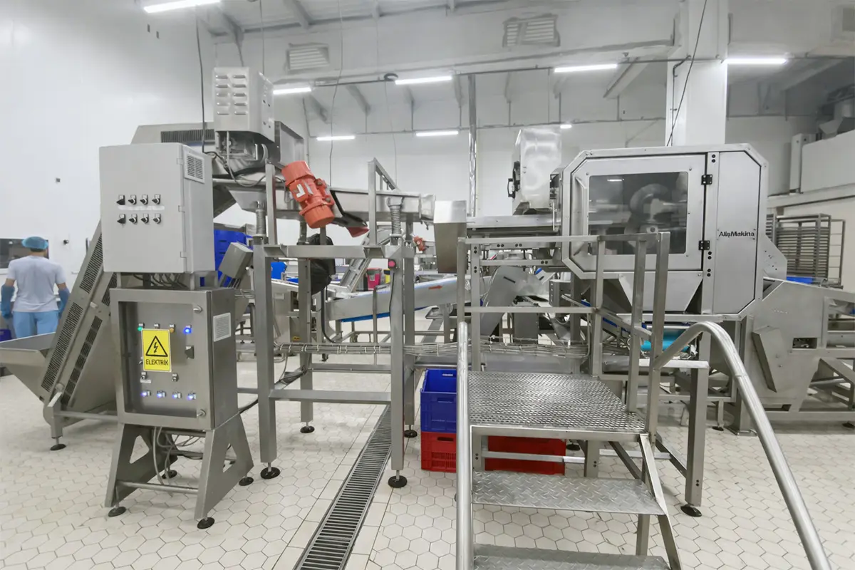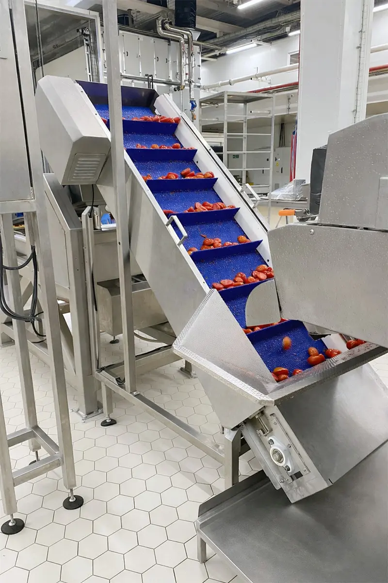 The system separates and organizes products through a vibrating unit located at the outlet of the cutting-slicing machine. The modular belt conveyor transports products in an aligned manner and ensures stable process progression. The elevator manages height differences and safely transfers products to the feeding point of the cup-up machine. This structure is designed to provide easy integration with existing lines.